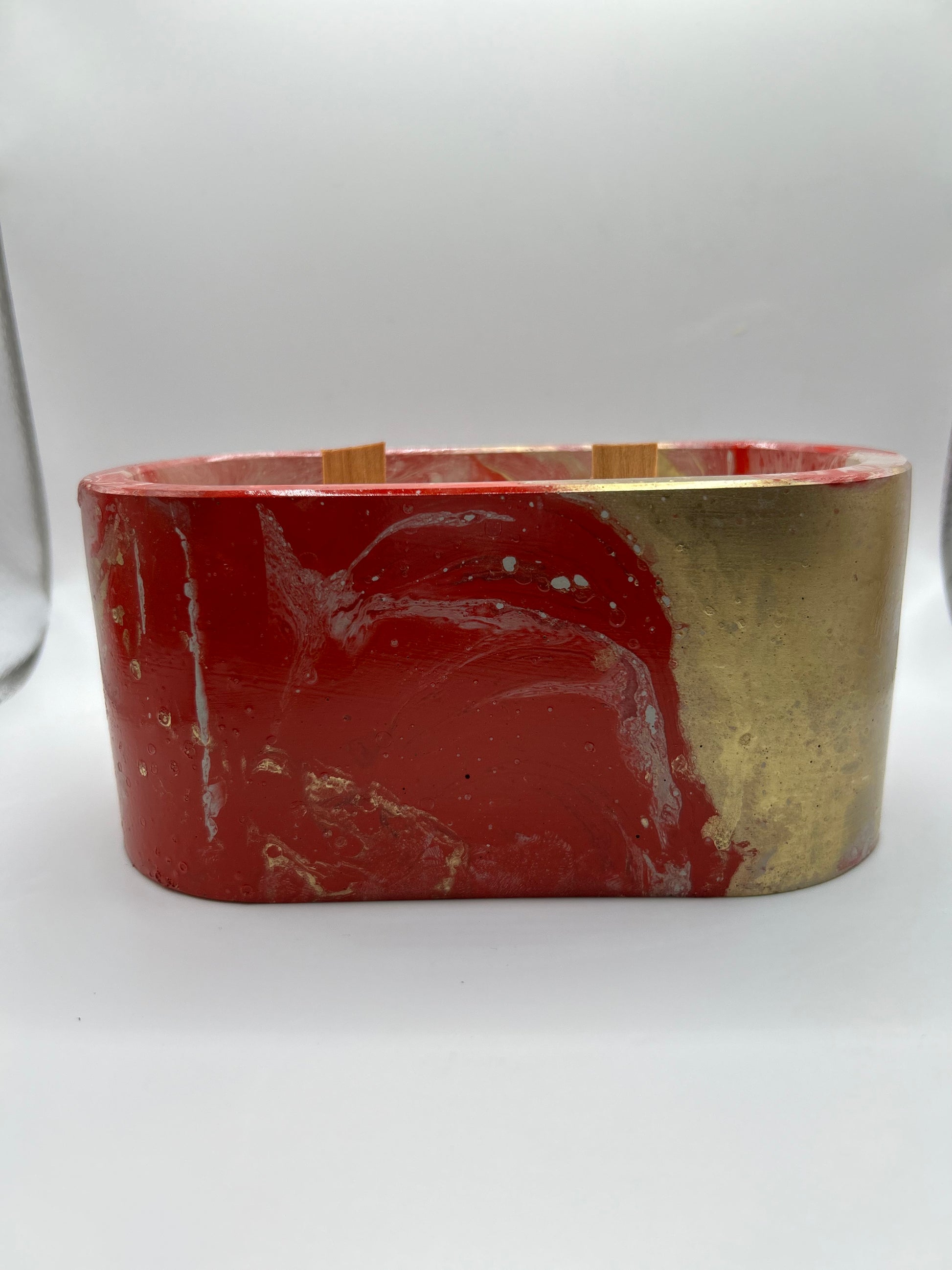 Handmade cement vessel hydro-dipped and hand poured coconut/soy wax with a premium wood wick.